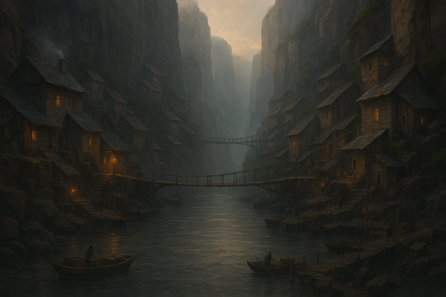 The bridges that span the canyon vary wildly in design. Some are no more than swaying ropes and wooden planks, patched with rawhide and prayers. Others are solid spans of cut stone, carved with wave motifs and talisman. A few arch high across the narrowest sections of the gorge, engineering marvels that gleam faintly with protective magic, their surfaces etched with the flowing scripts of old masters.